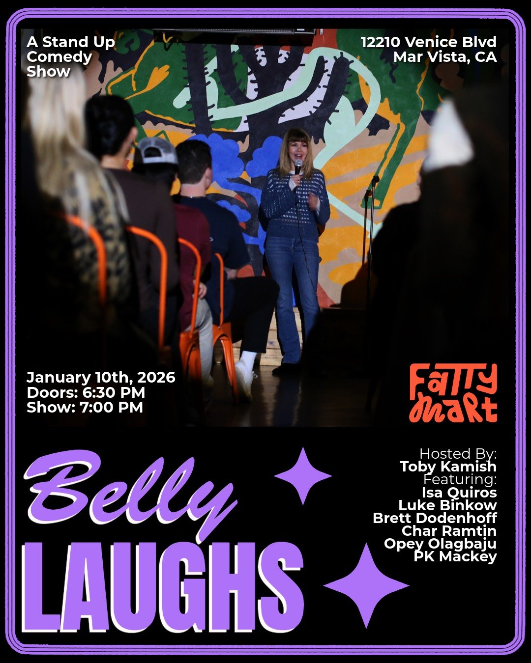 Belly Laughs is a stand up comedy show showcasing rising stars and seasoned veterans of the Los Angeles comedy scene. We've got killer comedians from Netflix Is Joke, Don't Tell Comedy, HBO, and the Comedy Store. Located within the indoor patio of Fatty Market.